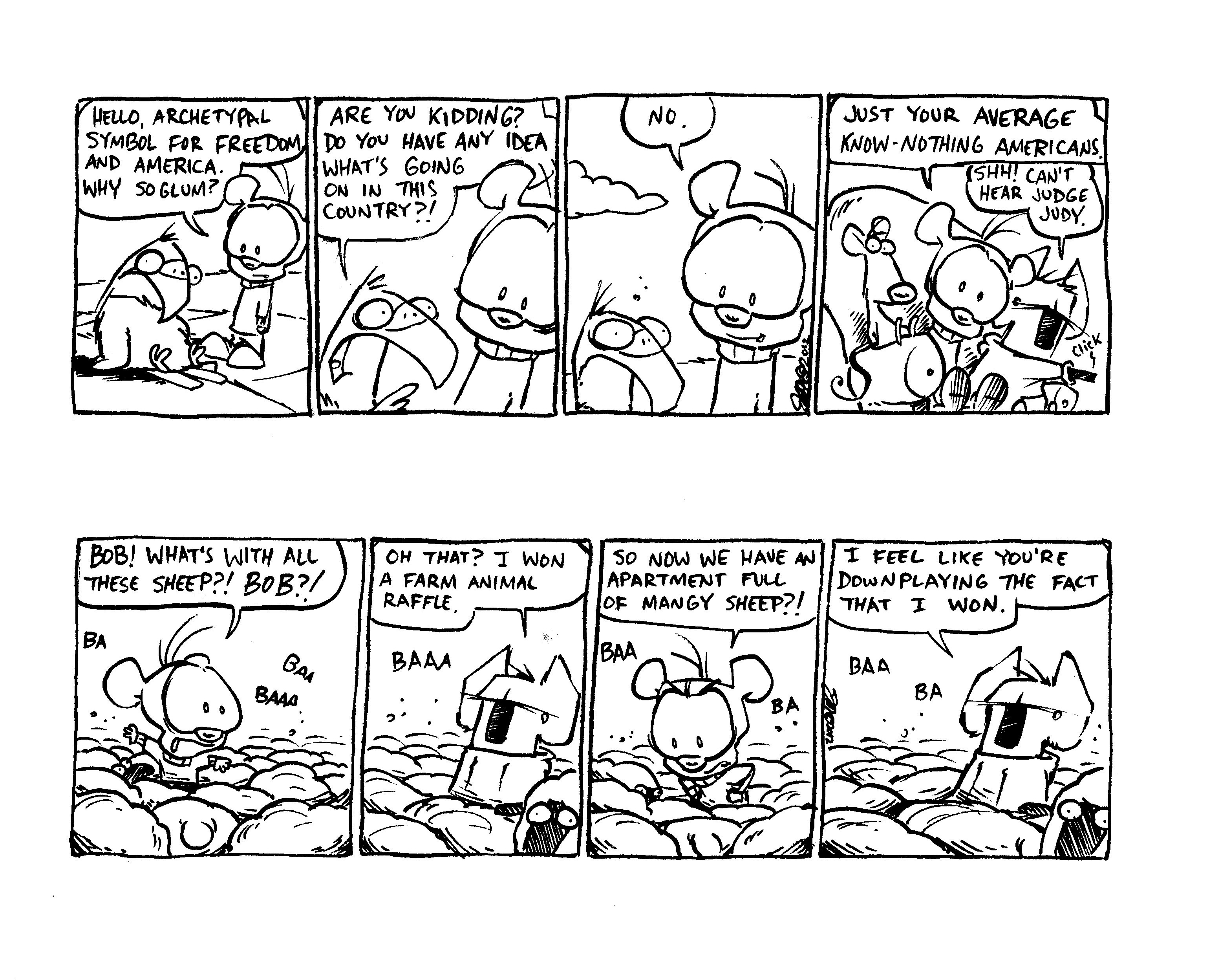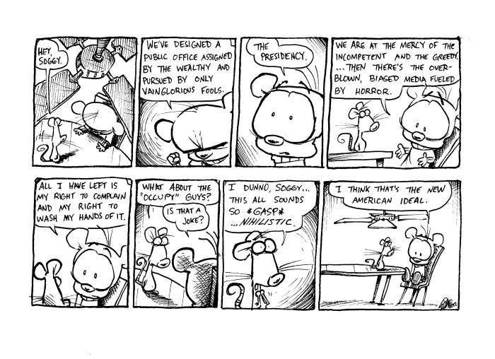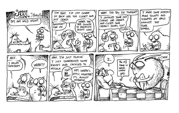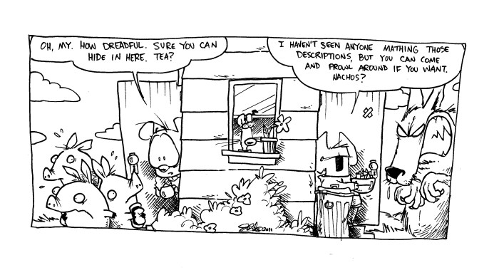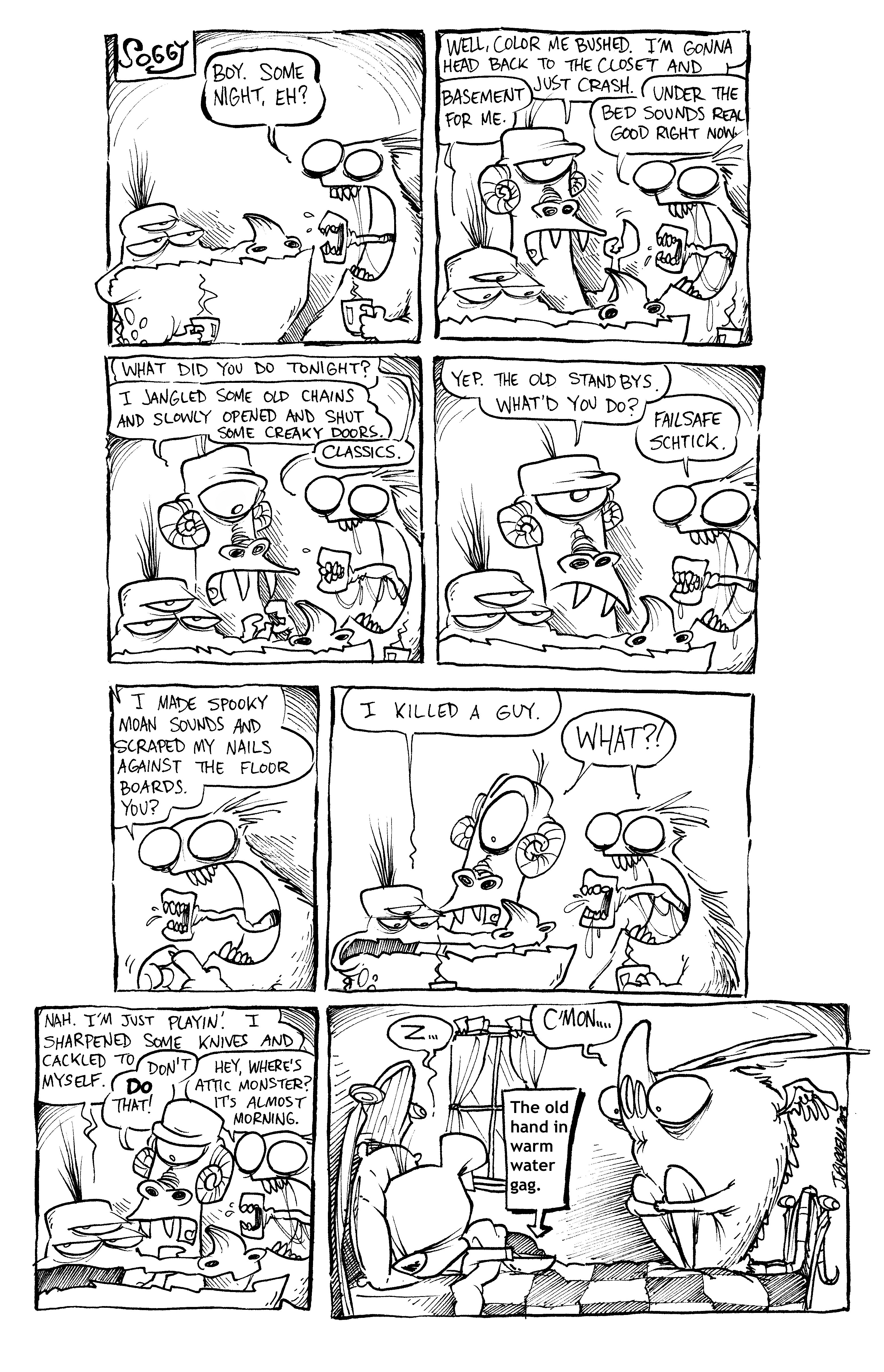 Typo: “I haven’t seen anyone matching those descriptions but you can come in and prowl around if you want. Nachos?”Two old, unrelated cartoons featuring the Soggy characters.