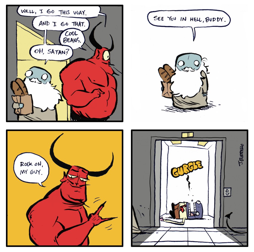 Straight from the Pit of Hell is a sprawling collection from the comic’s undisciplined origins up through the first gags to appear on Patheos-NonReligious. Short gags concerning existential dread and whatnot as well as the longer stories “Luna,” “The Debt,” “Skin (it’s my party and owl cry if I want to)”, “The Spiderhouse Rules”, and “Pilgrim’s Digress”.