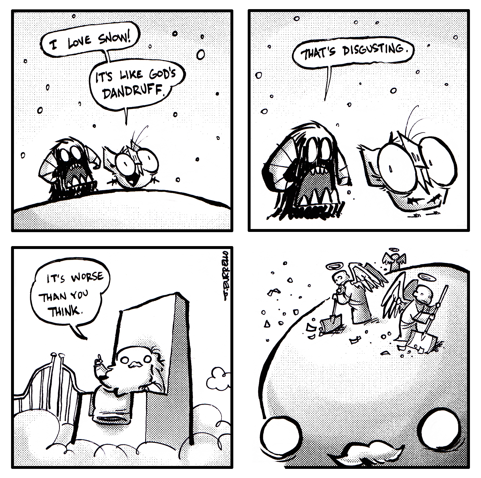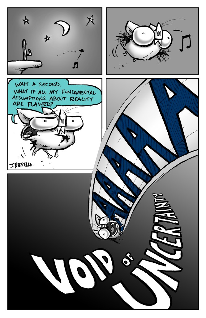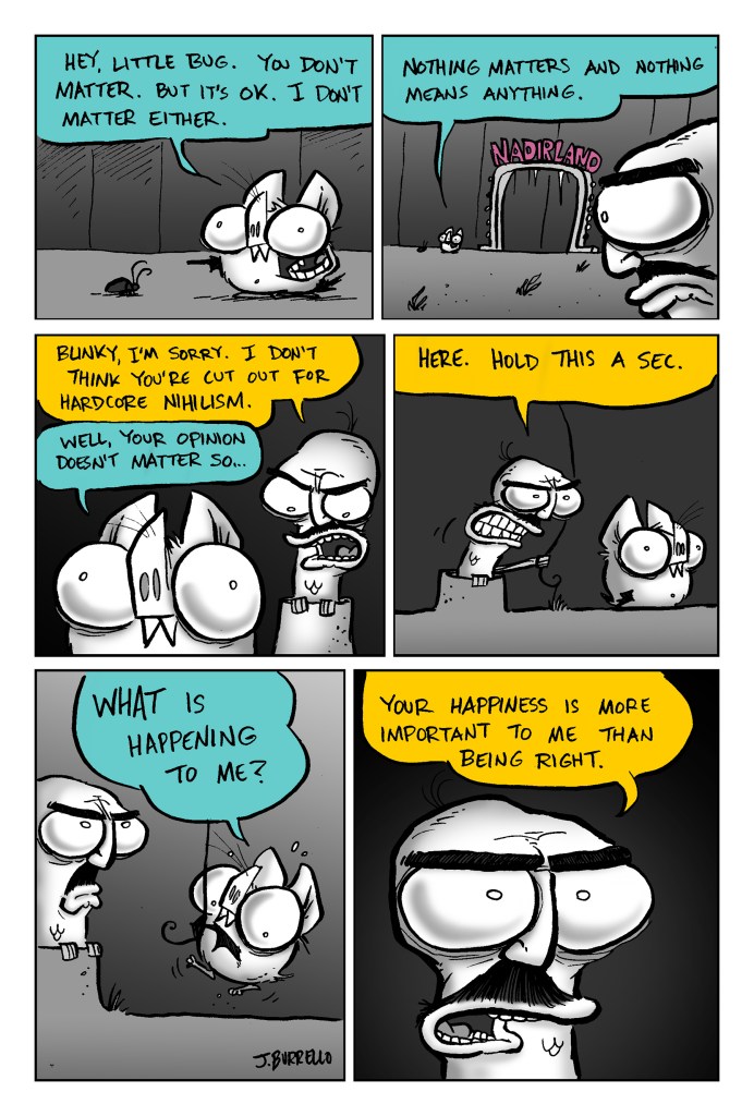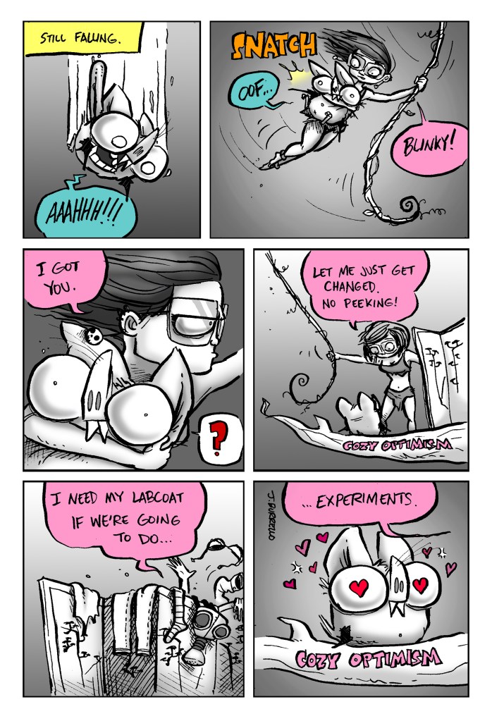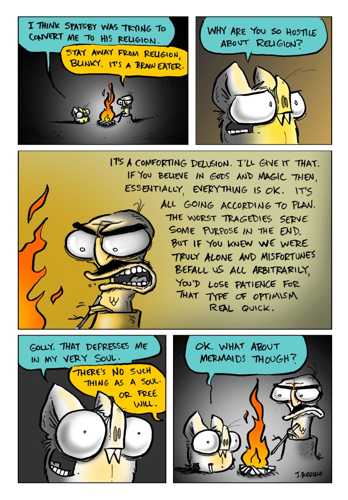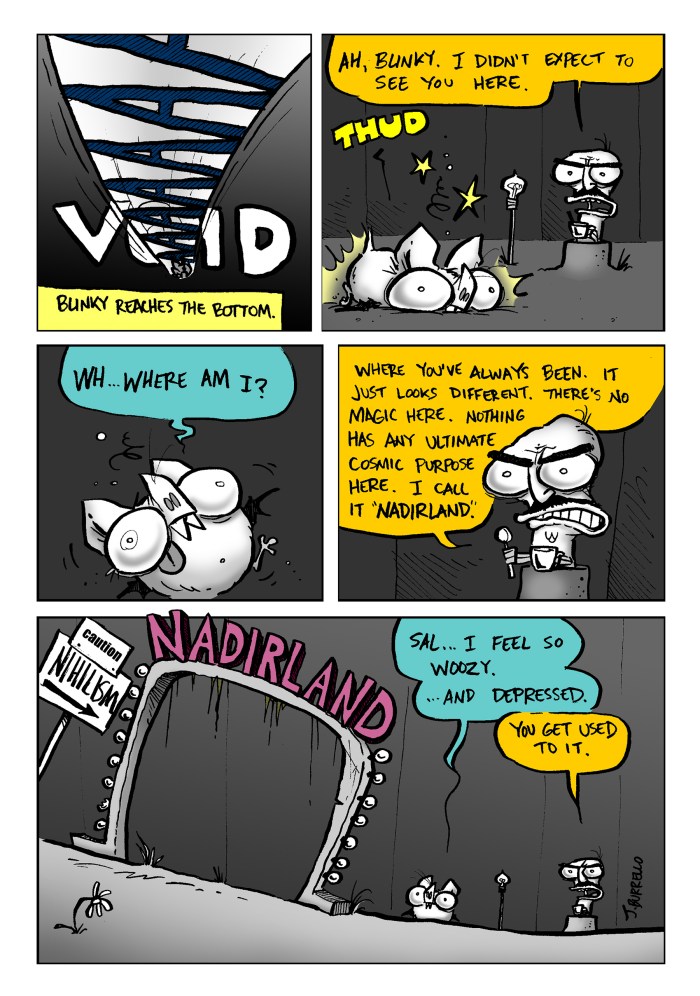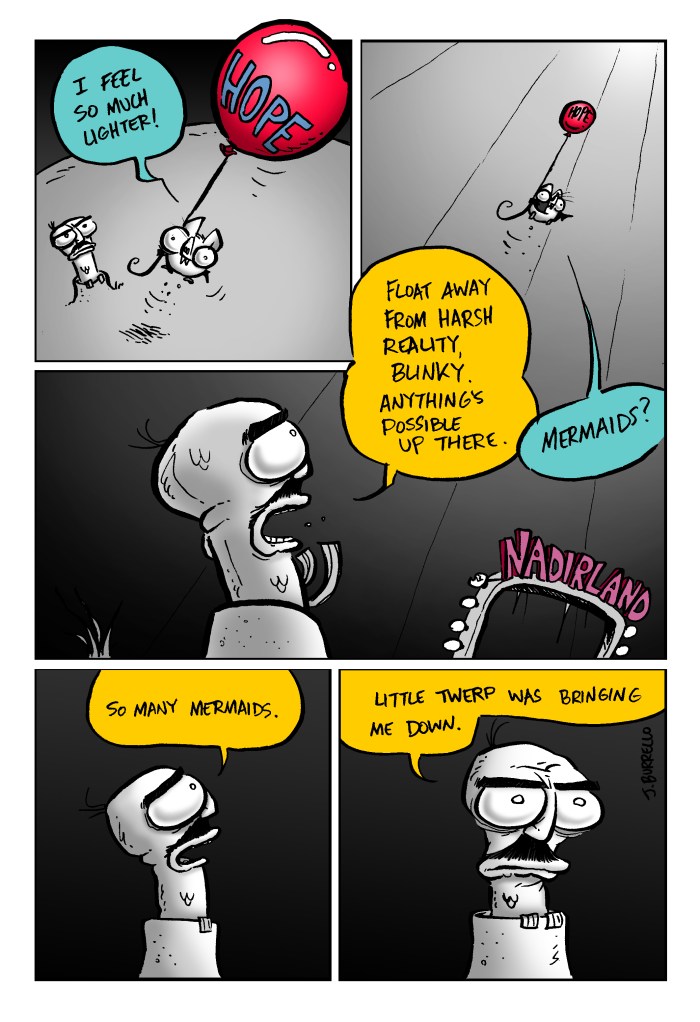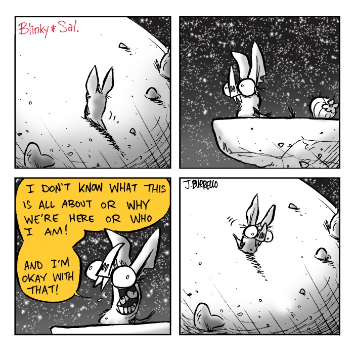 Because the written ending felt underwhelming, I chose to tag on one more older comic for a somewhat more satisfying conclusion.Β Spatsby and Sal are kind of set in their ways, but Blinky needed to stay malleable and free to grow more as a character, hence the lackluster original resolution. It felt more fitting to use one of the first Blinky and Sal comics that really captured the spirit of the strip and Blinky’s ideology as a proper finale, I think.Β Β