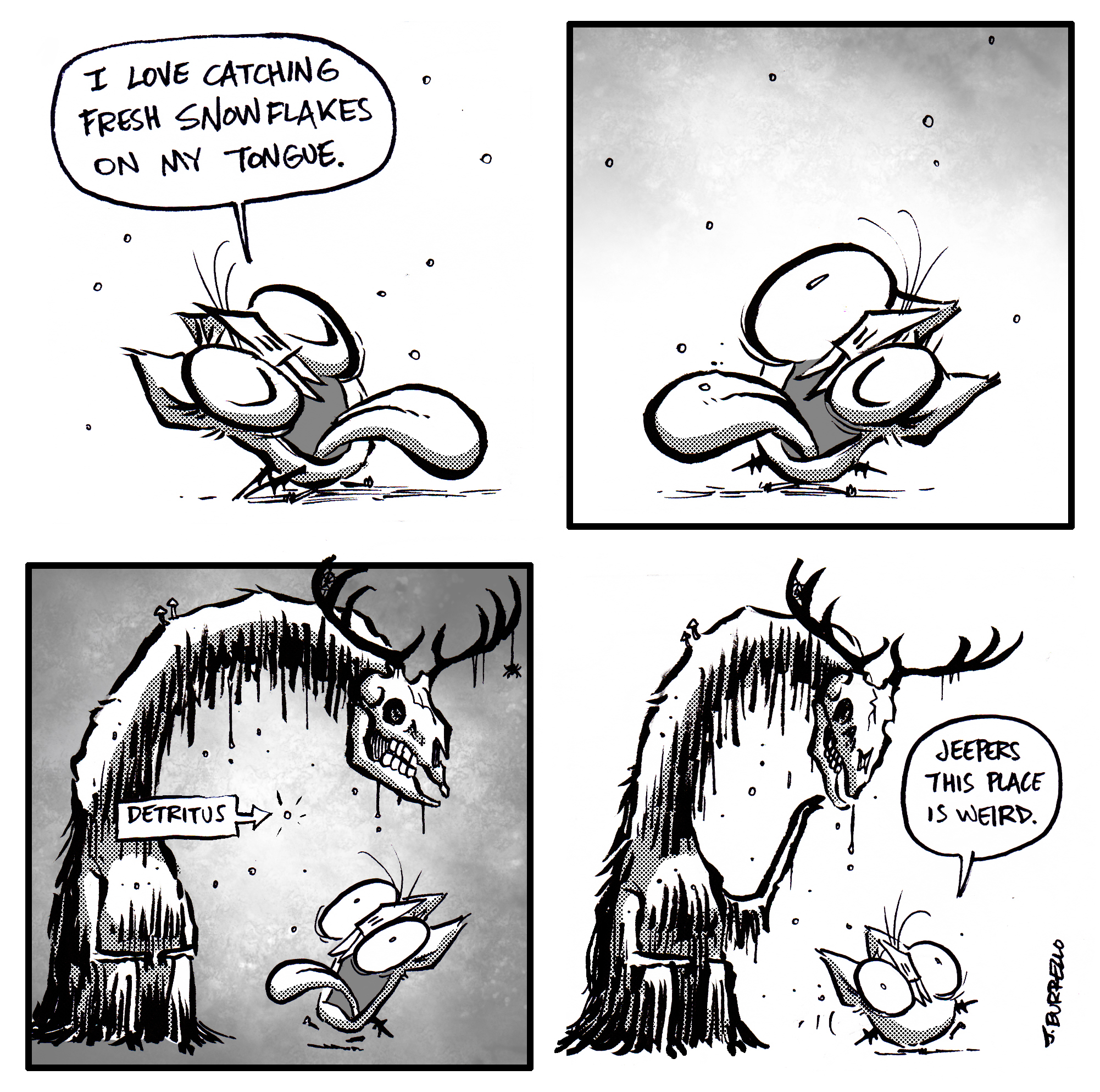 The earthy critter in this comic is actually an emissary for Melsie‘s cover of The Holly and the Ivy (which you can listen to on Bandcamp). It’s a witchy cover of the medeival holiday classic. I was privileged enough to design the image that accompanies the song