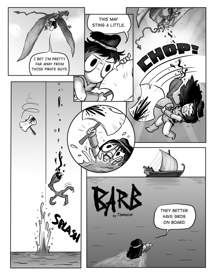 Barb has had her clan wiped out by skelemen. She’s been threatened by nomads, harassed by pig men, freed a murderous mermaid, chased by pirates, snatched by pteradactyls, accidentally become Queen of Submarinara, and killed the underwater god Cepha. She has no patience left for some twerpy weather demon.