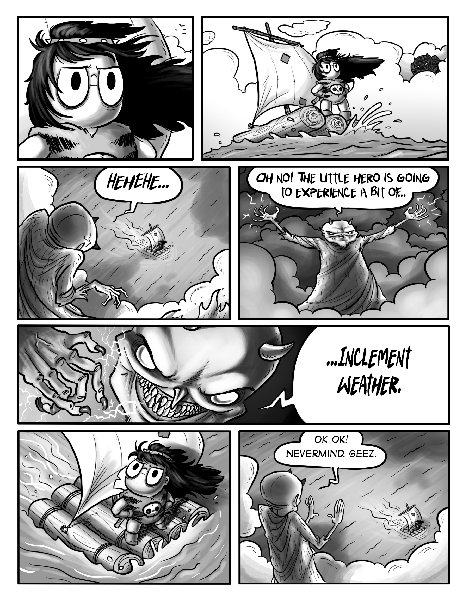 Barb has had her clan wiped out by skelemen. She’s been threatened by nomads, harassed by pig men, freed a murderous mermaid, chased by pirates, snatched by pteradactyls, accidentally become Queen of Submarinara, and killed the underwater god Cepha. She has no patience left for some twerpy weather demon.